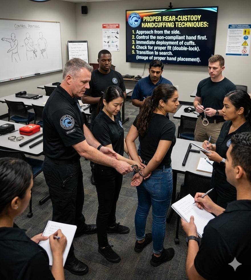 Includes de-escalation techniques, handcuffing skills, baton techniques, tactical flashlight training, and professional report writing.